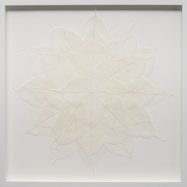 Miya Ando’s White Bodhi Leaf Meditation Mandala, 21×21 inches, framed, dyed bodhi skeleton leaves, monofilament, ragboard, 2015.