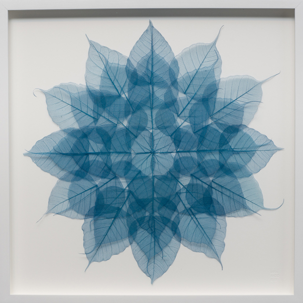 Miya Ando’s Bluel Bodhi Leaf Meditation Mandala, 21×21 inches, framed, dyed bodhi skeleton leaves, monofilament, ragboard, 2015.