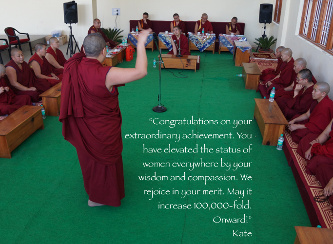 “Dear soon-to-be Geshe: Wishing you many realizations based upon your superb strides and efforts. We are overjoyed at your accomplishments. May your efforts benefit all beings. With respect.” Bhikshumi nun at Sravasti Abbey