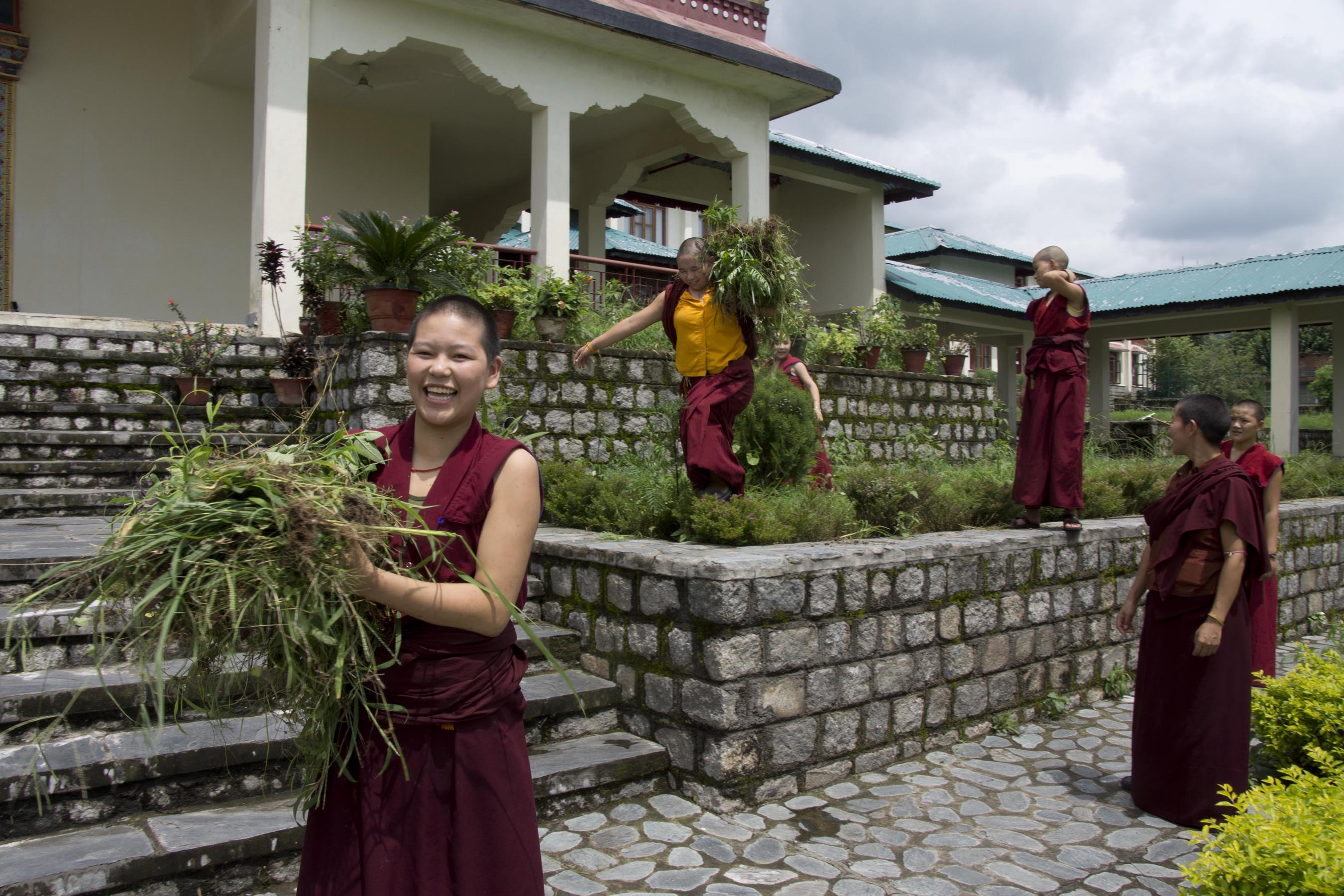 One of the many tasks of the nuns is to keep the nunnery grounds neat and tidy. Here, nuns at Shugsep Nunnery, work to keep the grass cut and the garden looking its best.
