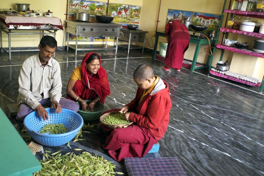 Shelling peas with helpers from the local community in the kitchen at Tilokpur Nunnery. Photo courtesy of Brian Harris.