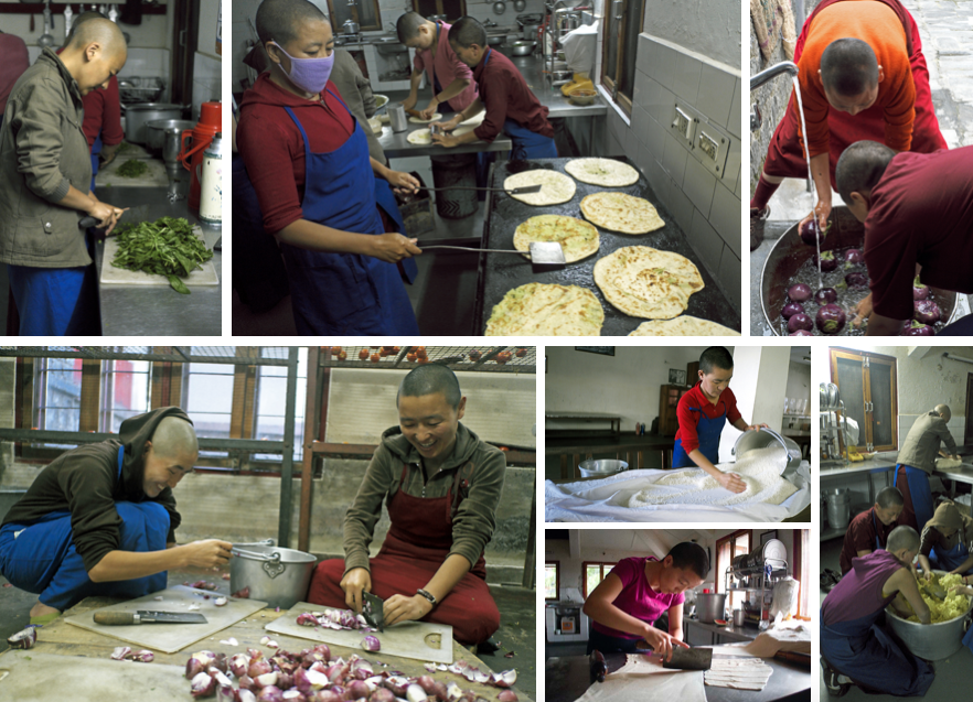 Collage of photos showing food preparation and cooking at Dolma Ling Nunnery. Photos courtesy of Brian Harris.