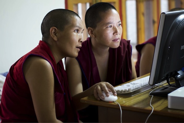 Photo courtesy of TNP volunteer Harald Weichhart showing two of the Dolma Ling nuns during their media studies