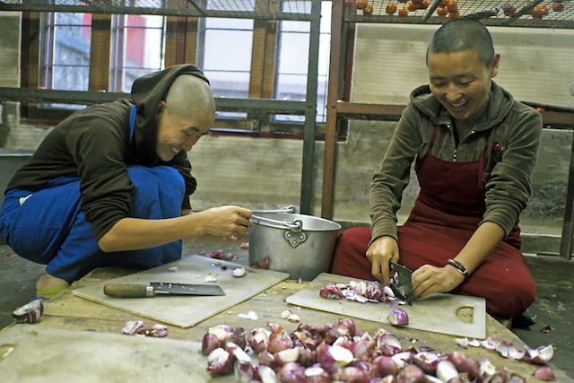 Chopping vegetables for about 280 people is a big job at Dolma Ling. The nuns take turns on kitchen duty. This photo and the above kitchen photo are courtesy of Brian Harris.