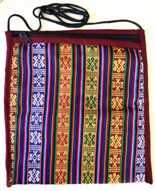 Each handmade bag is made with traditional bhutanese fabric and measures 8″ x 10,” has a 42″ nylon crossbody strap and a zipper closure.