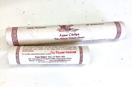 Flower – Flower incense, with a delicate fragrance, is used during prayers. Like blooming flowers, it brings peace and happiness. Main ingredients: saffron, rose and other special precious substances. Small contains approx. 25 sticks at 5 inches/ large contains approx. 17 sticks at 8.5 inches. Lama Chodpa incense is handmade at Tashi Jong Monastery in the Indian Himalayas.