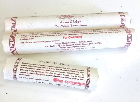 Meditation Incense – Helps to cleanse the inner channels as well as soothe and refresh the mind and body. Main ingredients: saffron, aloes wool, alof wood, Himalayan silver fir, holy sacred basil, and other special substances. Small contains approx. 25 sticks at 5 inches/ large contains approx. 17 sticks at 8.5 inches. Lama Chodpa incense is handmade at Tashi Jong Monastery in the Indian Himalayas.