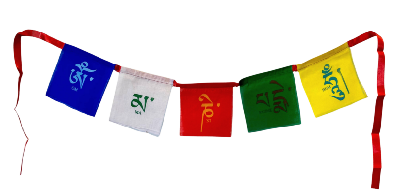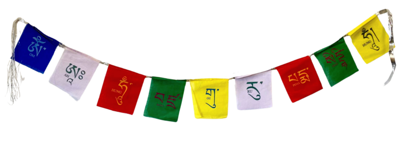 Each set of mantra prayer flags has one or two syllables of the mantra per flag. Mantras are a sequence of words or syllables that are chanted, usually repetitively, as part of Tibetan Buddhist practice. The five colors of Tibetan prayer flags represent the different elements: