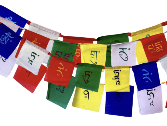 These prayer flags are printed with the ancient Tibetan mantra to Tara, Om Tare Tuttare Ture Soha. Tara is considered to be a Bodhisattva or Buddha of compassion, relieving us of physical, emotional, and spiritual suffering. Tara has 21 major forms, each of which has a different color and spiritual attribute, and this mantra is most associated with Green Tara. Of her 21 forms, two forms of Tara are especially loved by Tibetans – Green Tara, who is associated with abundance and enlightened activity, and White Tara, who is associated with compassion and long life.
