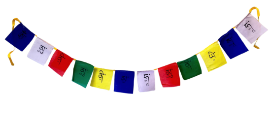 The symbols and mantras on prayer flags are sacred. Prayer flags should be treated with respect and they should not be placed on the ground. Old prayer flags should be burned. See our blog post on how to hang and dispose of old prayer flags.